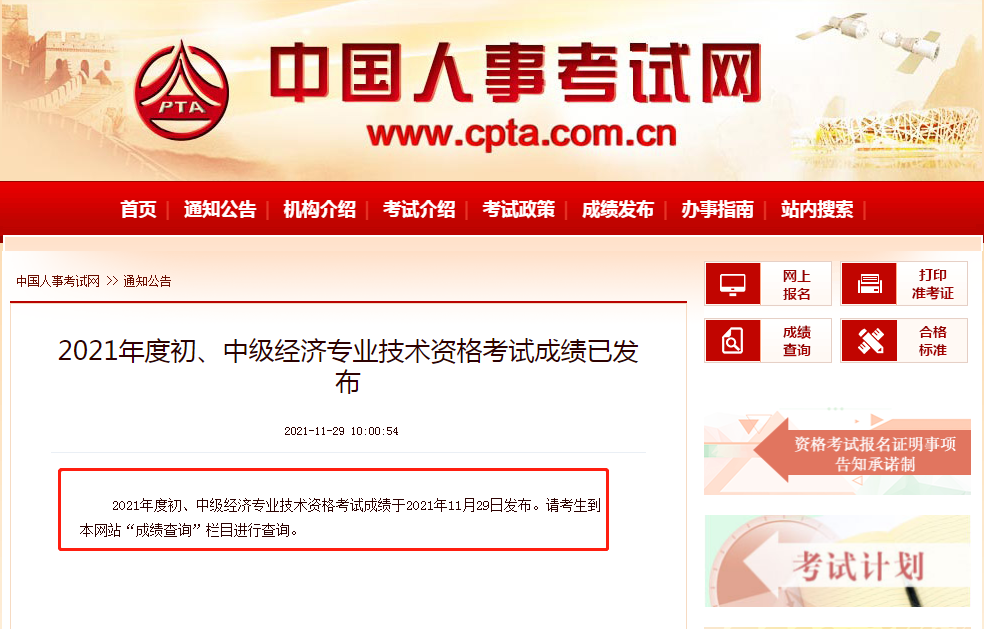 2021年度初中级经济专业技术资格考试成绩于2021年11月29日发布。请考生到中国人事考试网“成绩查询”栏目进行查询。
