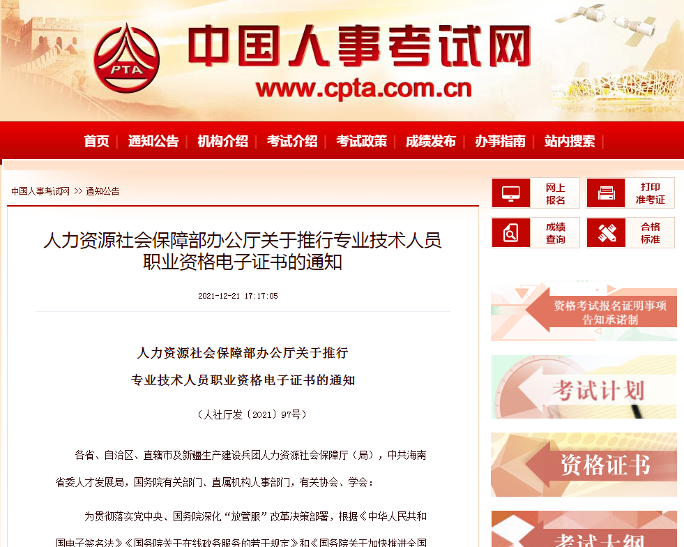 四、以上专业技术人员职业资格电子证书可在中国人事考试网(网址:www.cpta.com.cn)进行下载和查询验证,与纸质证书具有同等法律效力。推行电子证书后,纸质证书仍按照原方式制发。已制发的纸质证书遗失、损毁,或者逾期不领取的,不再办理补发。