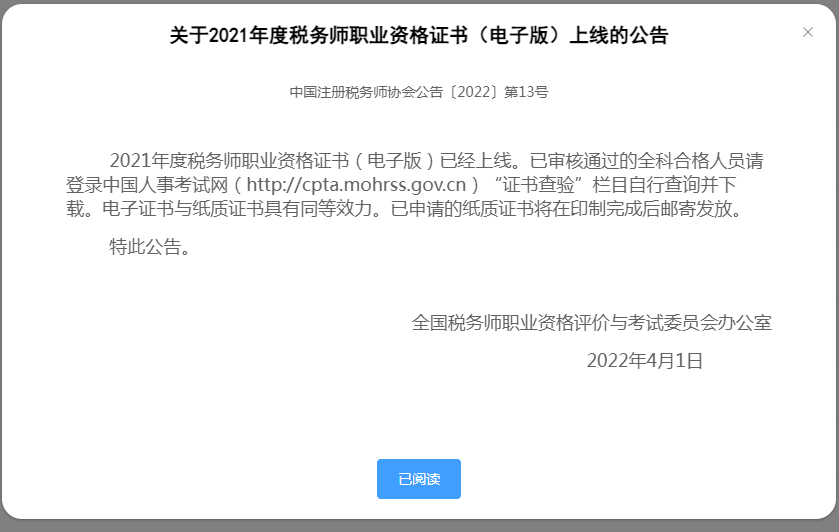 上考教育从中国注册税务师协会了解到,2022年4月1日开始,2021年度税务师职业资格证书(电子版)已经上线,2021年税务师考试通过的人员可以领取电子证书了,为了推行无纸化办公方式,电子证书与纸质证书具有同等效力。已审核通过的全科合格人员请登录中国人事考试网(http://cpta.mohrss.gov.cn)“证书查验”栏目自行查询并下载,已申请的纸质证书将在印制完成后邮寄发放。