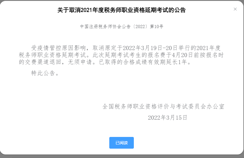 上考教育从中国注册税务师协会官网得知,原定于2022年3月19日-20日举行的2021年度税务师职业资格延期考试已经被取消,包括陕西、河南、深圳、山西等因疫情原因没有参加考试的人员,接下来就直接参加2022年的考试,2021年没有来得及考试的人员考试成绩有效期将会延长一年,报名费于4月20日前按报名时的交费渠道退回,无须申请。希望广大考生留意自己的手机短信通知,及时的调整考试计划,给大家带来的不便,敬请谅解。