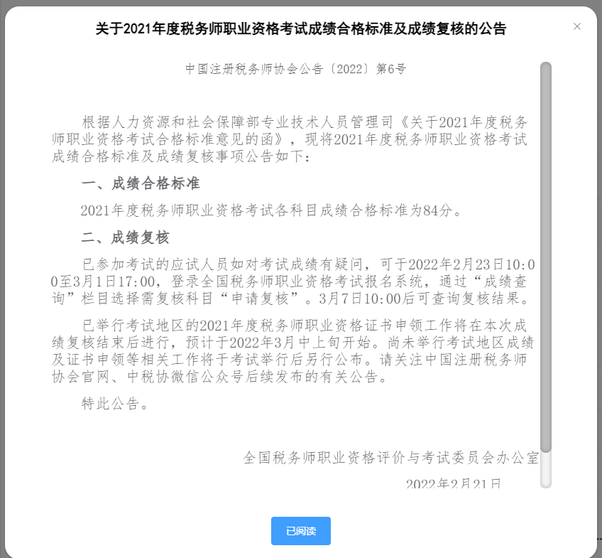 关于2021年度税务师职业资格考试成绩合格标准及成绩复核的公告