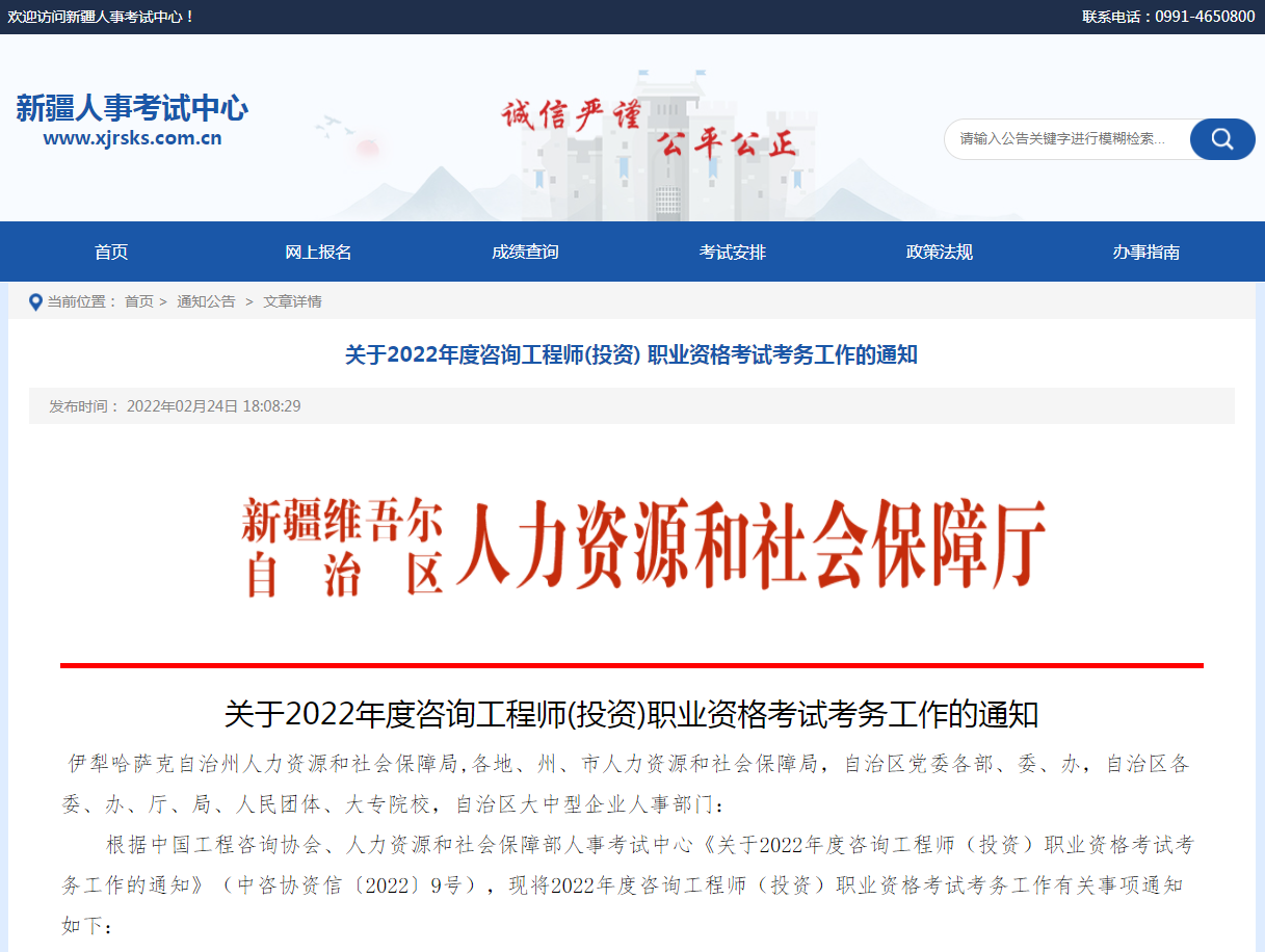关于2022年度新疆咨询工程师(投资)职业资格考试考务工作的通知