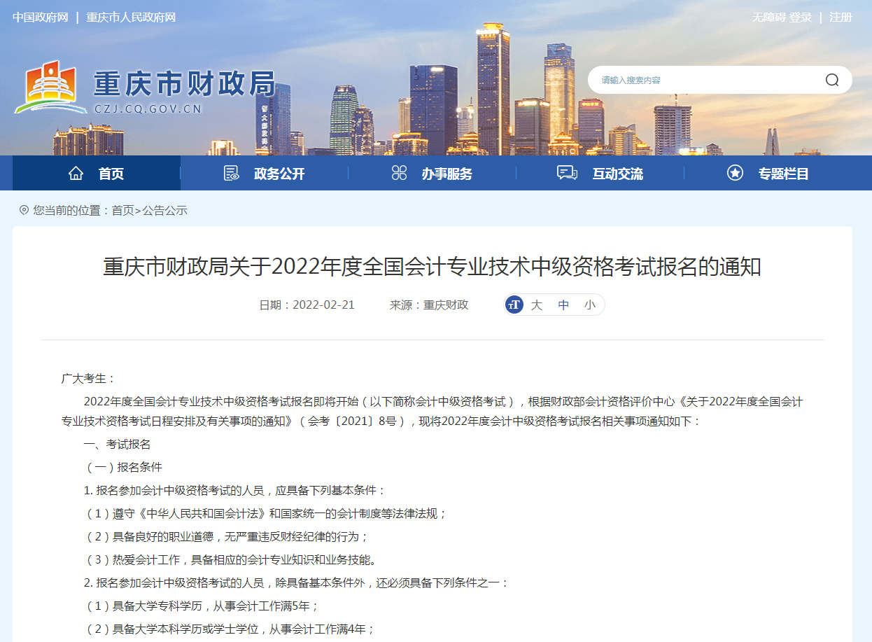 重庆市财政局关于2022年度全国会计专业技术中级资格考试报名的通知