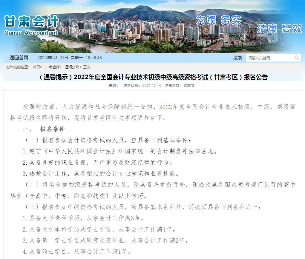 2022年度全国会计专业技术初级中级高级资格考试(甘肃考区)报名公告
