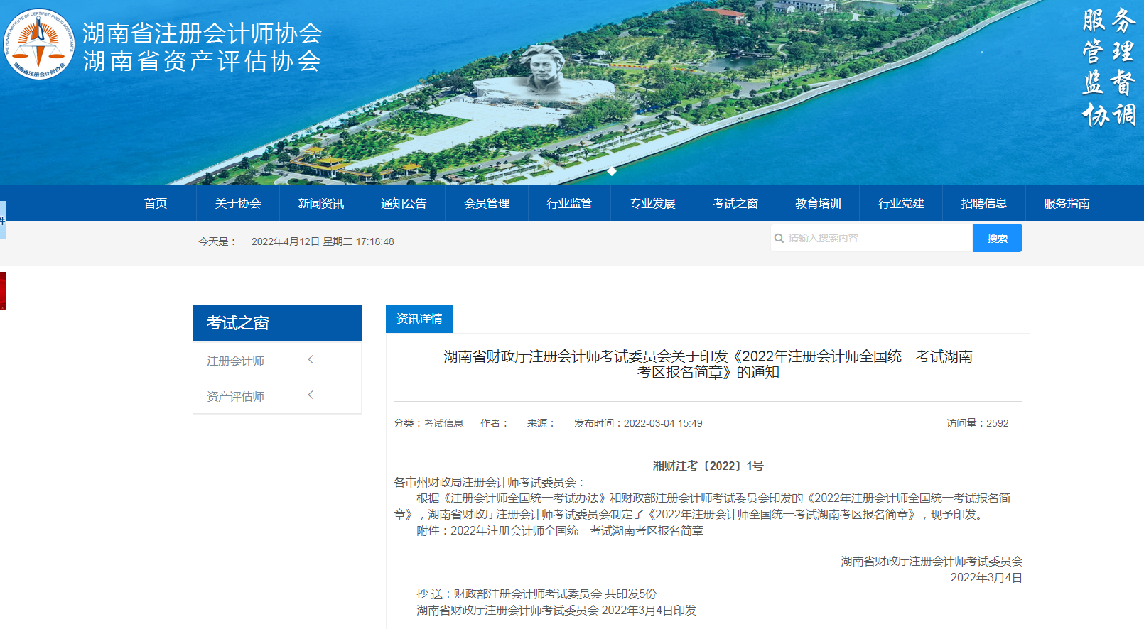 2022年注册会计师全国统一考试湖南考区报名简章