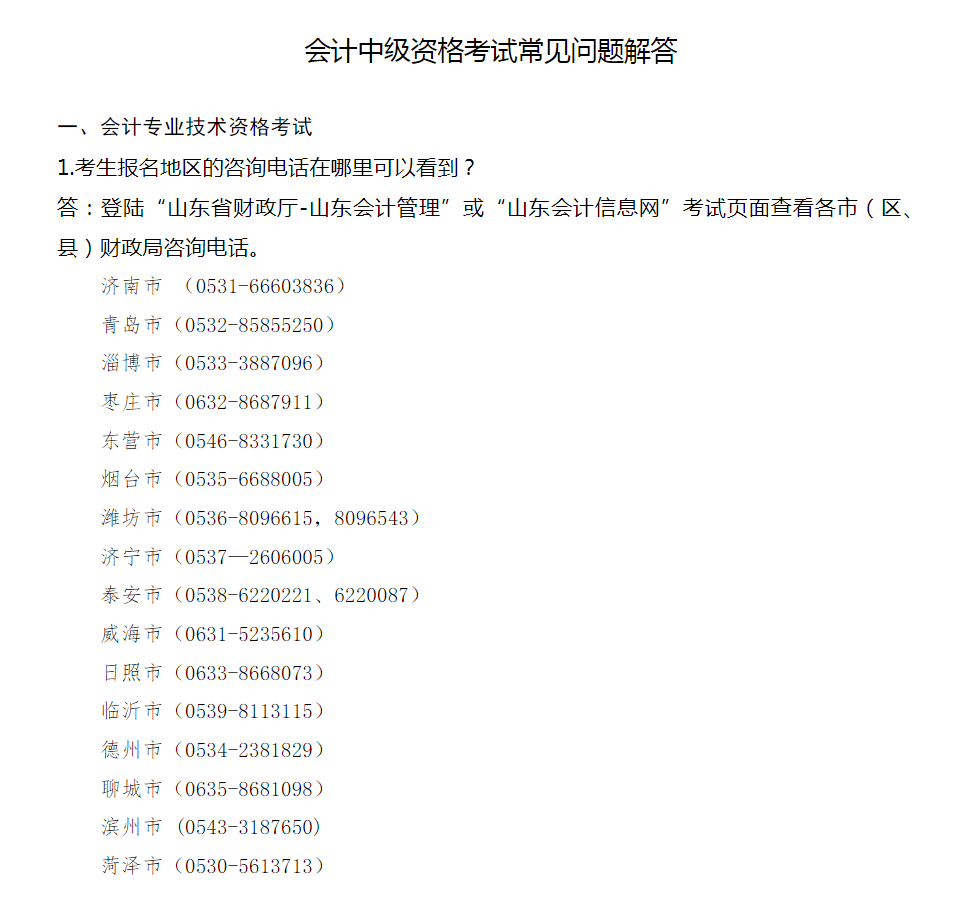 答:登陆“山东省财政厅-山东会计管理”或“山东会计信息网”考试页面查看各市(区、县)财政局咨询电话。
