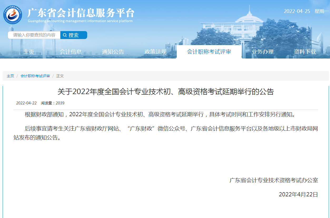 关于2022年度广东省会计专业技术初、高级资格考试延期举行的公告