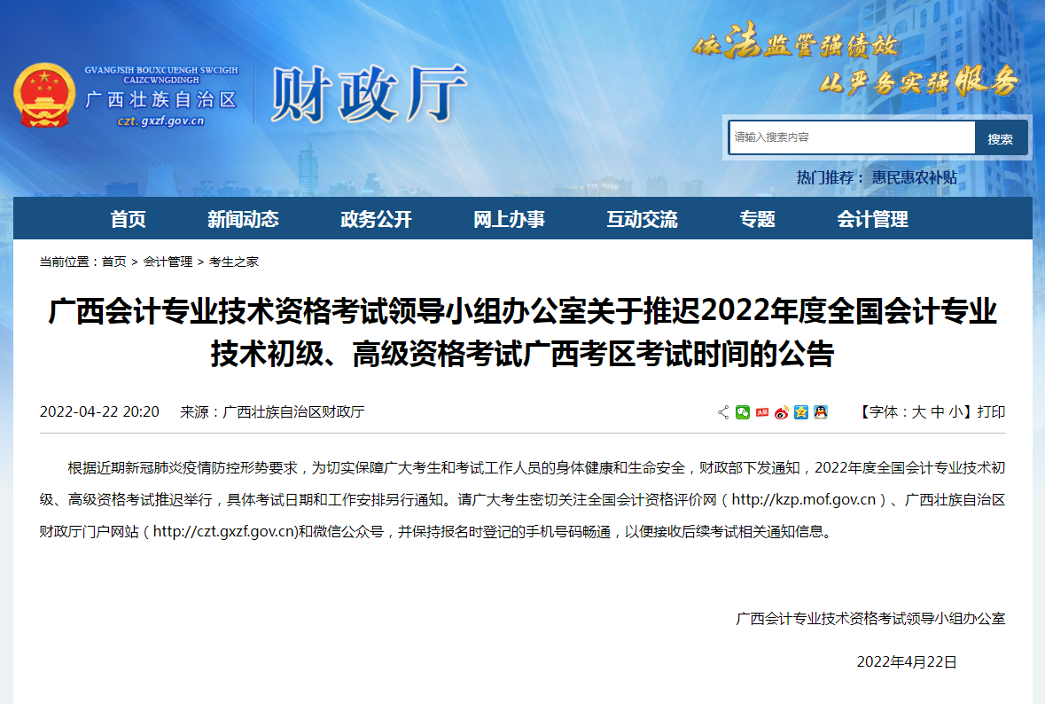 广西会计专业技术资格考试领导小组办公室关于推迟2022年度全国会计专业技术初级、高级资格考试广西考区考试时间的公告