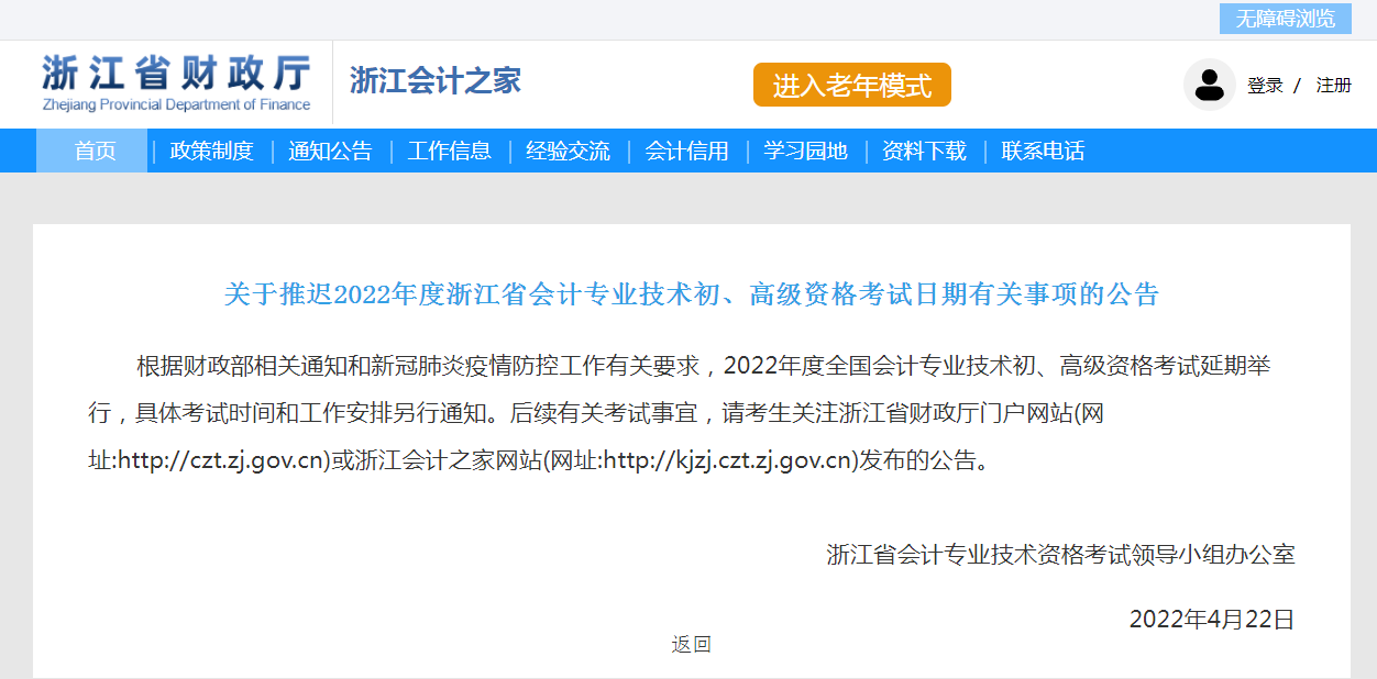 根据财政部相关通知和新冠肺炎疫情防控工作有关要求,2022年度全国会计专业技术初、高级资格考试延期举行,具体考试时间和工作安排另行通知。后续有关考试事宜,请考生关注浙江省财政厅门户网站(网址:http://czt.zj.gov.cn)或浙江会计之家网站(网址:http://kjzj.czt.zj.gov.cn)发布的公告。