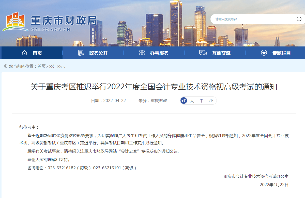 关于重庆考区推迟举行2022年度全国会计专业技术资格初高级考试的通知
