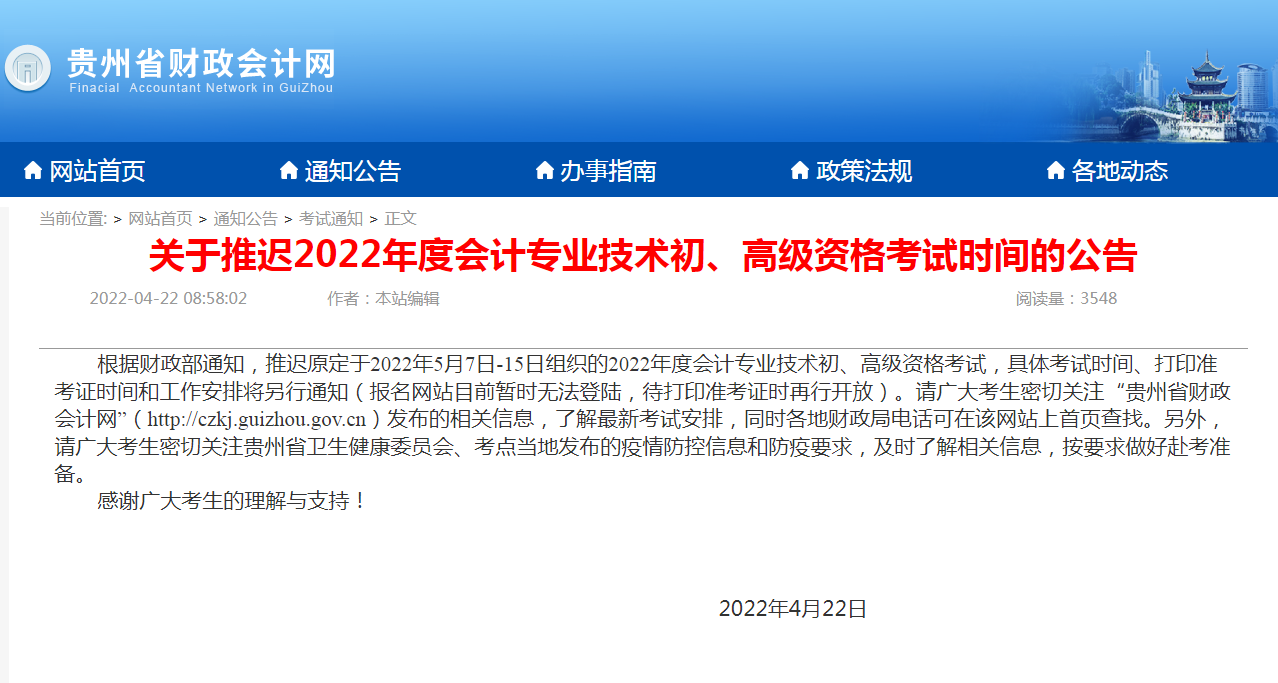关于贵州考区推迟举行2022年度全国会计专业技术资格初高级考试的通知