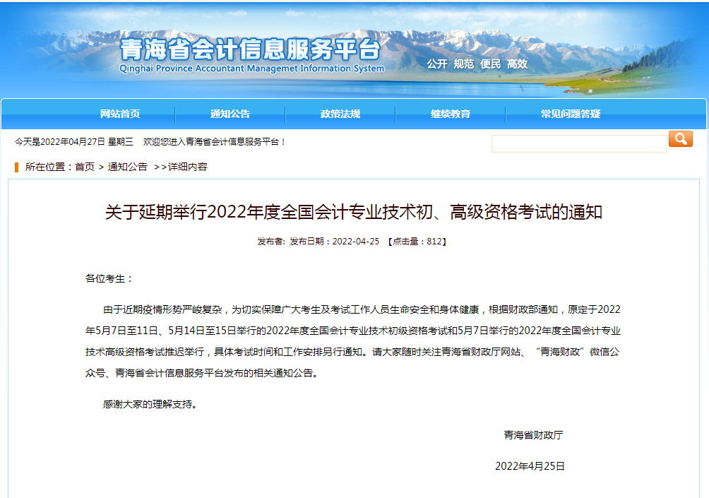 关于延期举行2022年度青海省会计专业技术初、高级资格考试的通知