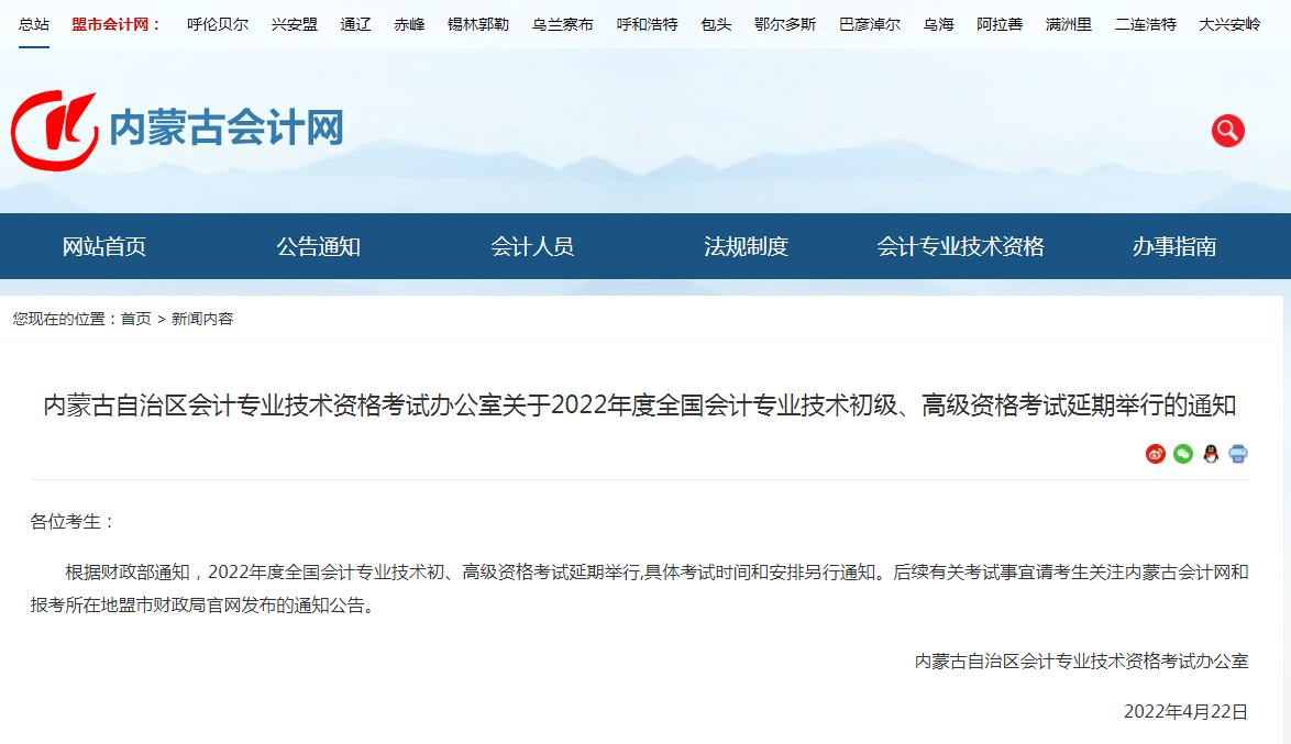 内蒙古自治区会计专业技术资格考试办公室关于2022年度全国会计专业技术初级、高级资格考试延期举行的通知