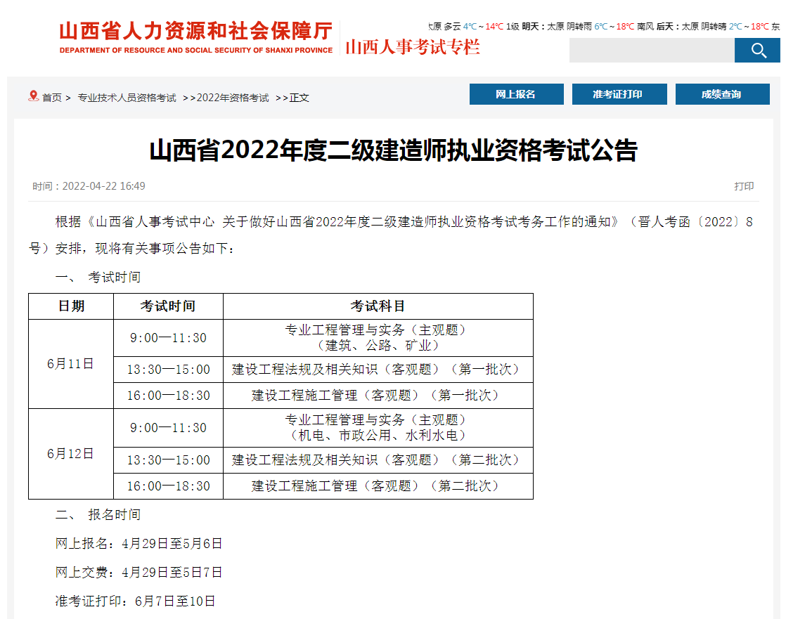 根据《山西省人事考试中心关于做好山西省2022年度二级建造师执业资格考试考务工作的通知》(晋人考函〔2022〕8号)安排,现将有关事项公告如下: