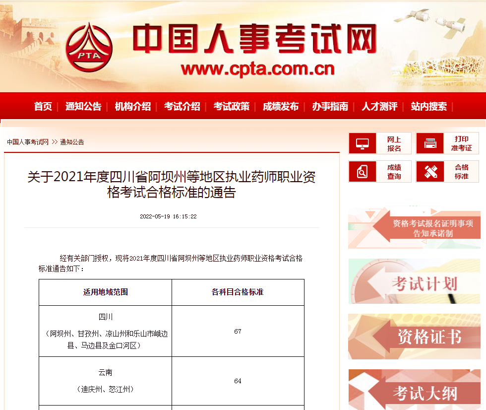 关于2021年度四川省阿坝州等地区执业药师职业资格考试合格标准的通告