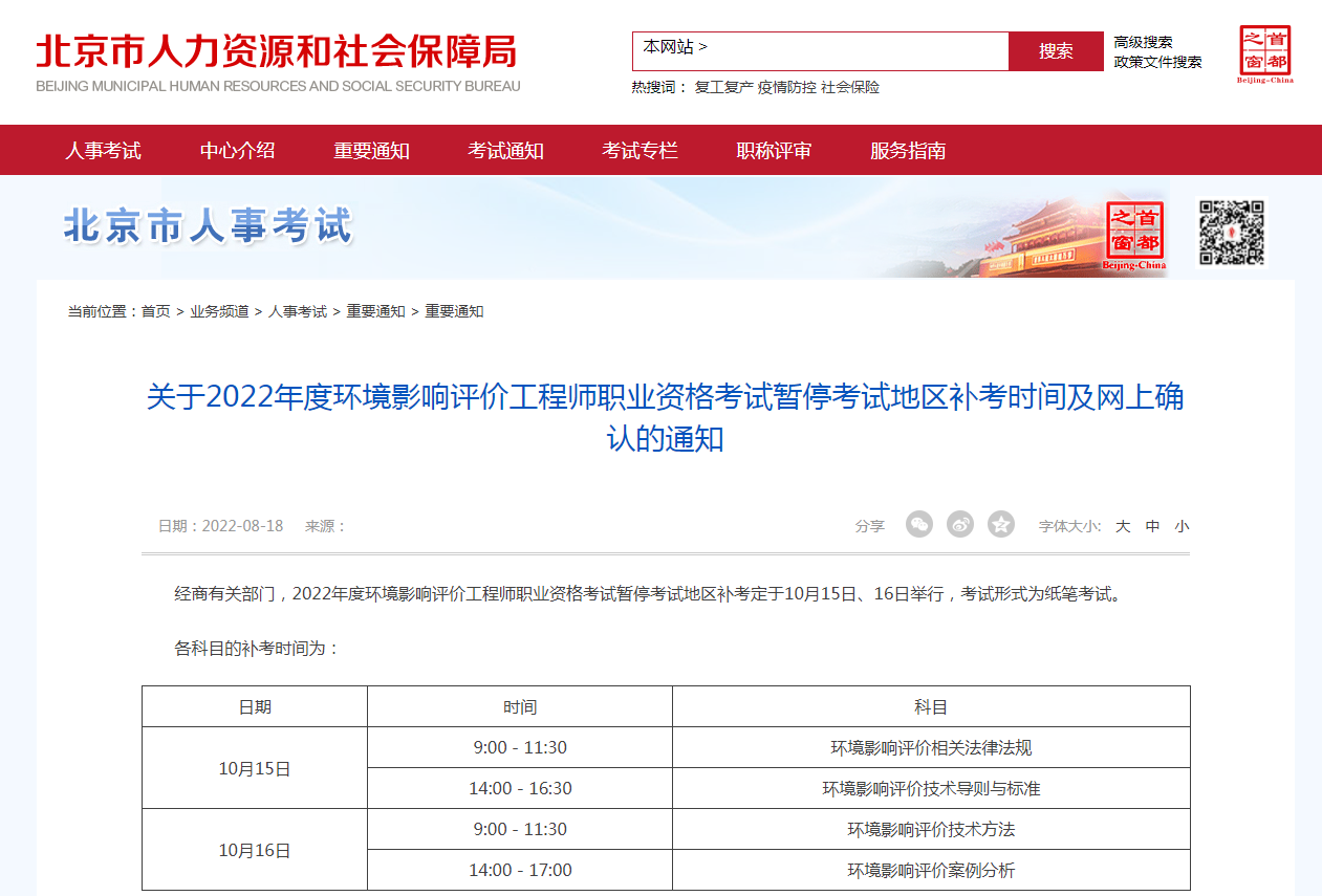 经商有关部门,2022年度环境影响评价工程师职业资格考试暂停考试地区补考定于10月15日、16日举行,考试形式为纸笔考试。