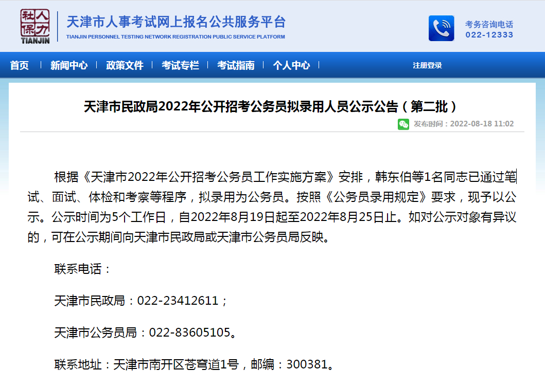 根据《天津市2022年公开招考公务员工作实施方案》安排,韩东伯等1名同志已通过笔试、面试、体检和考察等程序,拟录用为公务员。按照《公务员录用规定》要求,现予以公示。公示时间为5个工作日,自2022年8月19日起至2022年8月25日止。如对公示对象有异议的,可在公示期间向天津市民政局或天津市公务员局反映。
