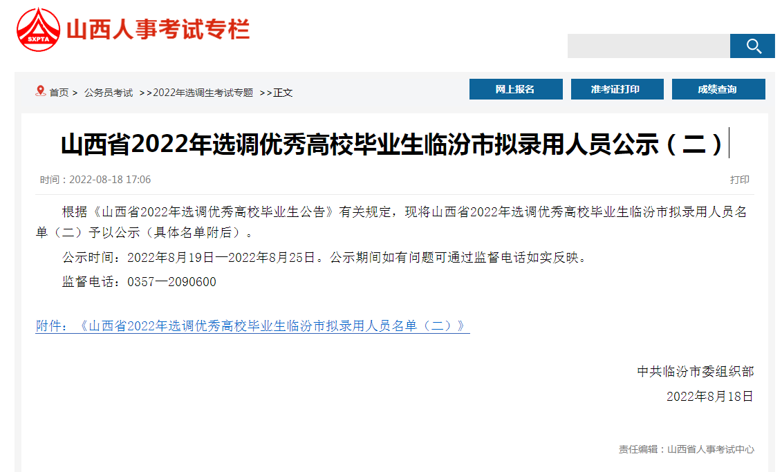 根据《山西省2022年选调优秀高校毕业生公告》有关规定,现将山西省2022年选调优秀高校毕业生临汾市拟录用人员名单(二)予以公示(具体名单附后)。