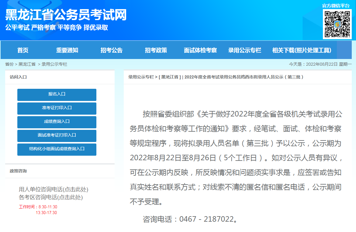 上考教育从黑龙江人事考试官网获悉,2022年度黑龙江省鸡西市公务员考试拟录用人员名单已公示,没有参加任何补习班,不知道教程会是什么样子,你会发现公开考试实际上是你的能力,而不仅仅是知识储备,这就是为什么有些人即使不参加任何培训也能通过考试原因。现将有关事项公告如下: