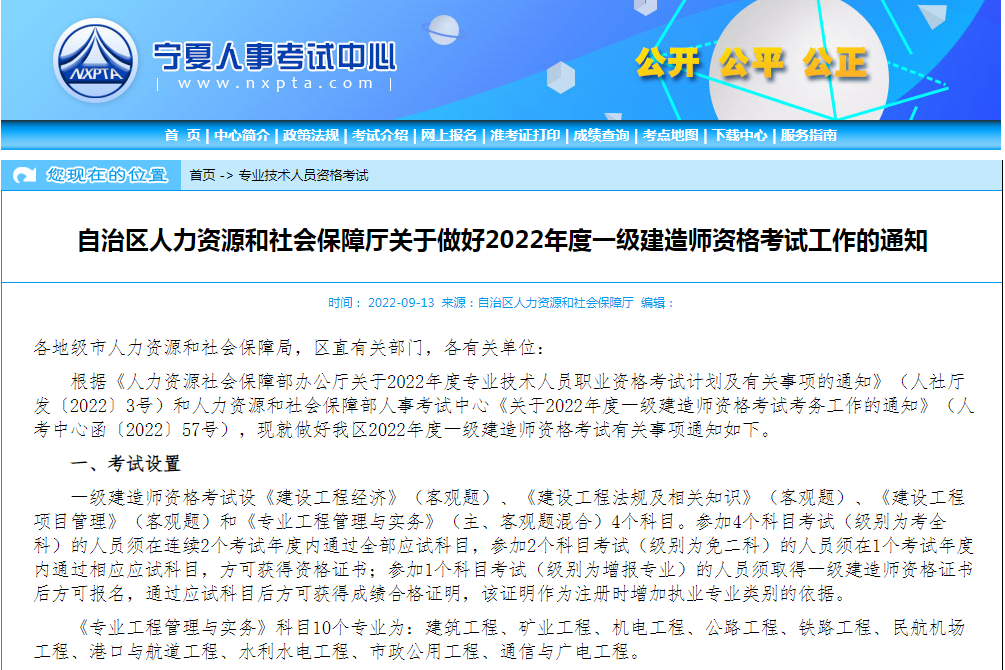 根据《人力资源社会保障部办公厅关于2022年度专业技术人员职业资格考试计划及有关事项的通知》(人社厅发〔2022〕3号)和人力资源和社会保障部人事考试中心《关于2022年度一级建造师资格考试考务工作的通知》(人考中心函〔2022〕57号),现就做好宁夏2022年度一级建造师资格考试有关事项通知如下。