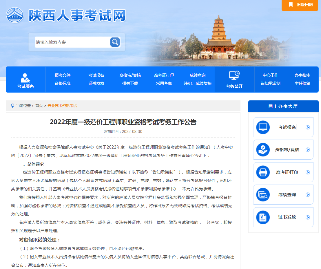根据人力资源和社会保障部人事考试中心《关于2022年度一级造价工程师职业资格考试考务工作的通知》(人考中心函〔2022〕53号)要求,现就陕西省实施2022年度一级造价工程师职业资格考试考务工作有关事项公告如下: