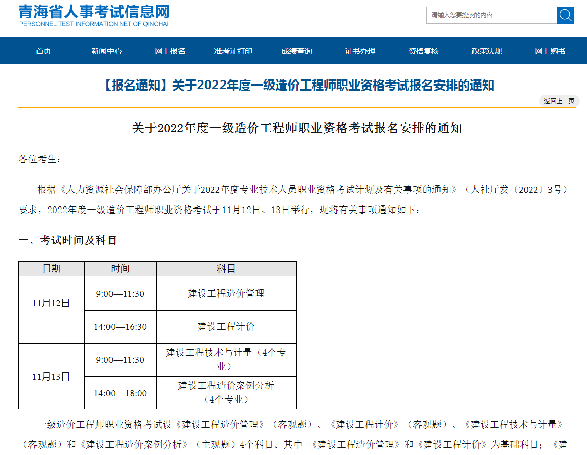 根据《人力资源社会保障部办公厅关于2022年度专业技术人员职业资格考试计划及有关事项的通知》(人社厅发〔2022〕3号)要求,2022年度一级造价工程师职业资格考试于11月12日、13日举行,现将有关事项通知如下: