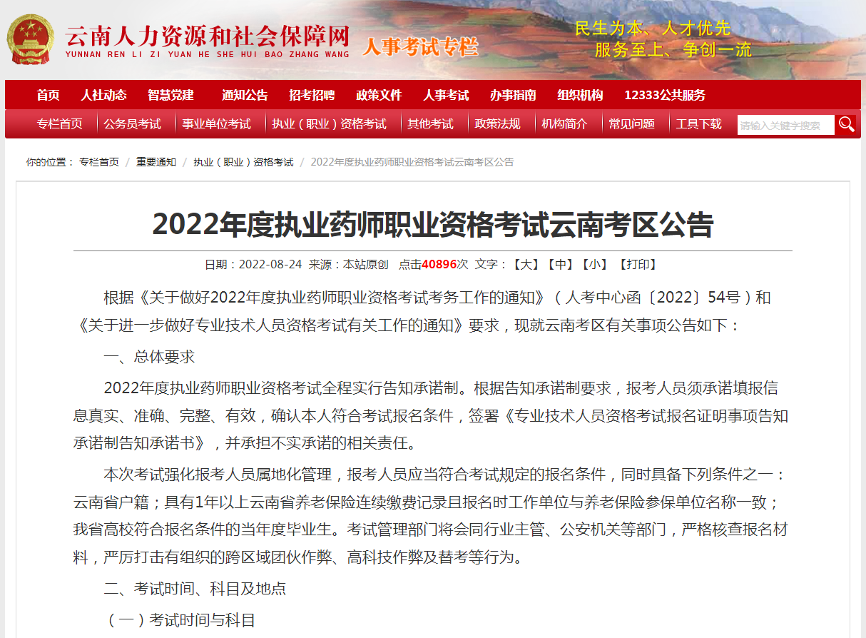 根据《关于做好2022年度执业药师职业资格考试考务工作的通知》(人考中心函〔2022〕54号)和《关于进一步做好专业技术人员资格考试有关工作的通知》要求,现就云南考区有关事项公告如下: