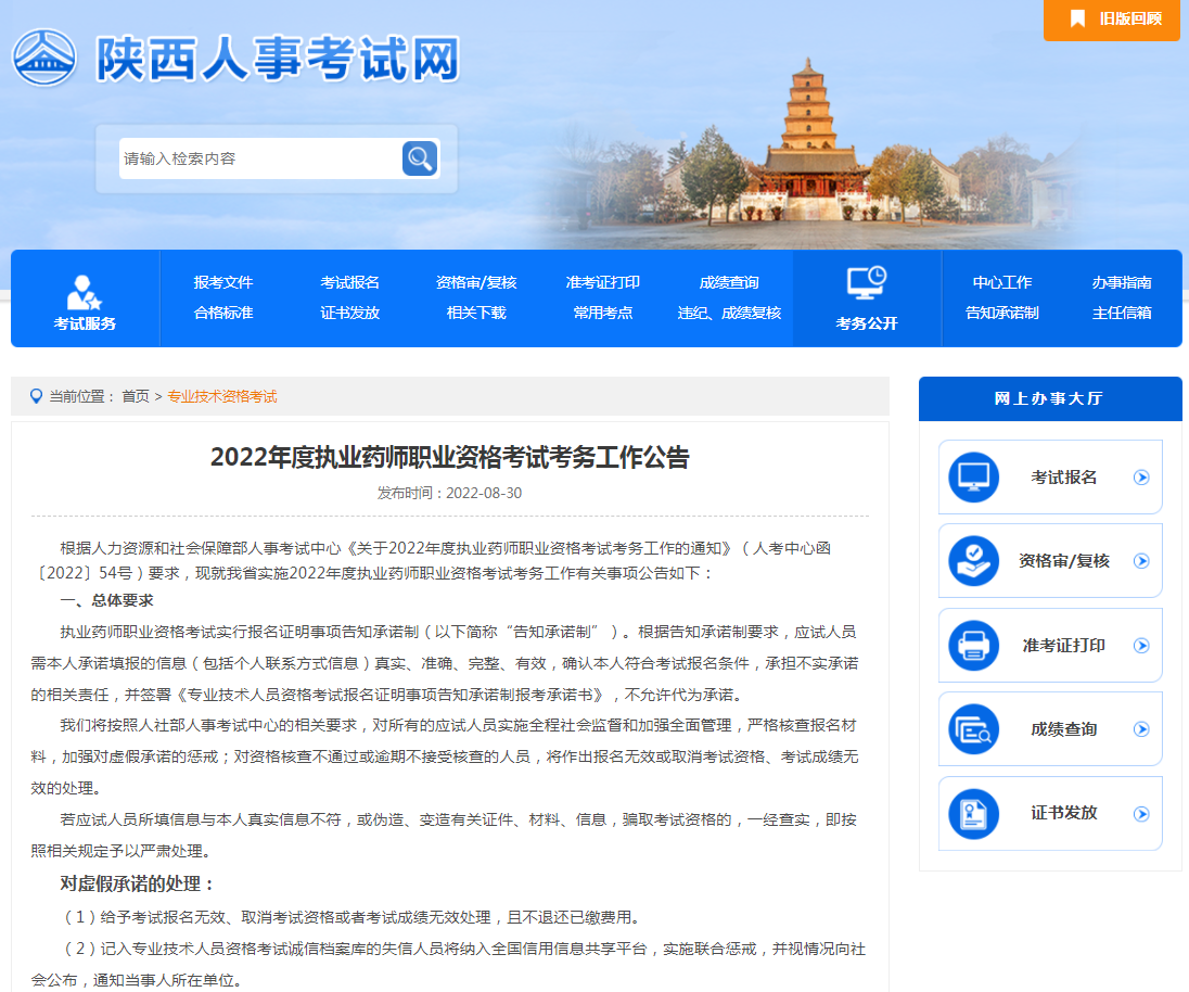 根据人力资源和社会保障部人事考试中心《关于2022年度执业药师职业资格考试考务工作的通知》(人考中心函〔2022〕54号)要求,现就陕西省实施2022年度执业药师职业资格考试考务工作有关事项公告如下: