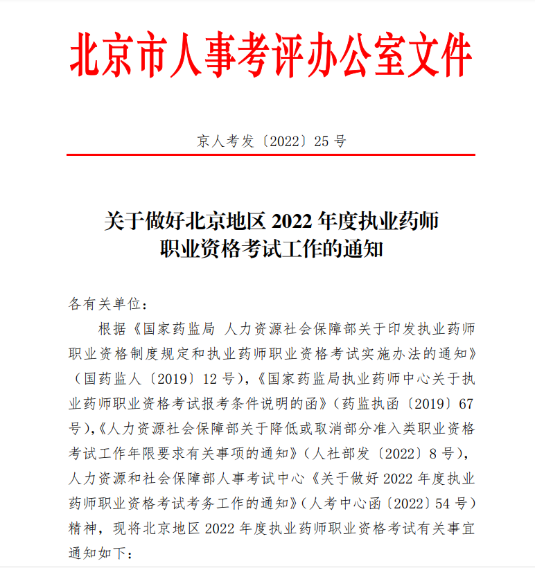 (国药监人〔2019〕12号),《国家药监局执业药师中心关于执业药师职业资格考试报考条件说明的函》(药监执函〔2019〕67号),《人力资源社会保障部关于降低或取消部分准入类职业资格考试工作年限要求有关事项的通知》(人社部发〔2022〕8号),人力资源和社会保障部人事考试中心《关于做好2022年度执业药师职业资格考试考务工作的通知》(人考中心函〔2022〕54号)精神,现将北京地区2022年度执业药师职业资格考试有关事宜通知如下: