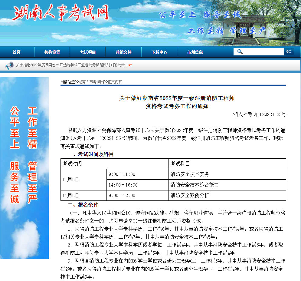 根据人力资源社会保障部人事考试中心《关于做好2022年度一级注册消防工程师资格考试考务工作的通知》(人考中心函〔2022〕55号)精神,为做好湖南省2022年度一级注册消防工程师资格考试考务工作,现就有关事项通知如下: