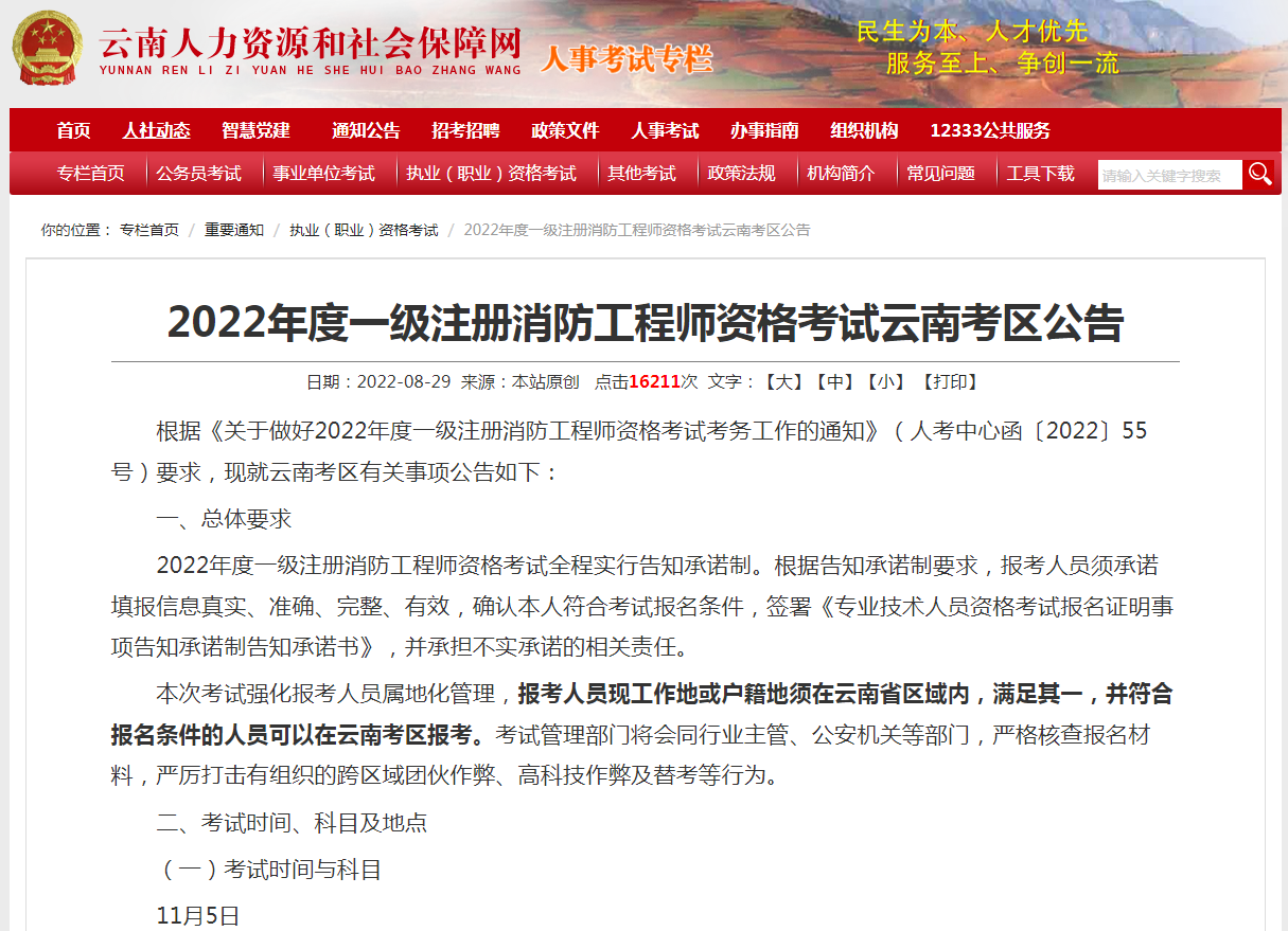 根据《关于做好2022年度一级注册消防工程师资格考试考务工作的通知》(人考中心函〔2022〕55号)要求,现就云南考区有关事项公告如下: