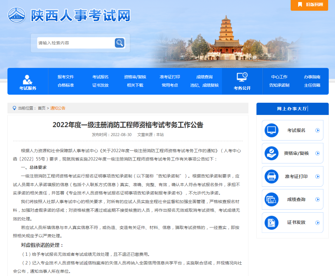 根据人力资源和社会保障部人事考试中心《关于2022年度一级注册消防工程师资格考试考务工作的通知》(人考中心函〔2022〕55号)要求,现就陕西省实施2022年度一级注册消防工程师资格考试考务工作有关事项公告如下:
