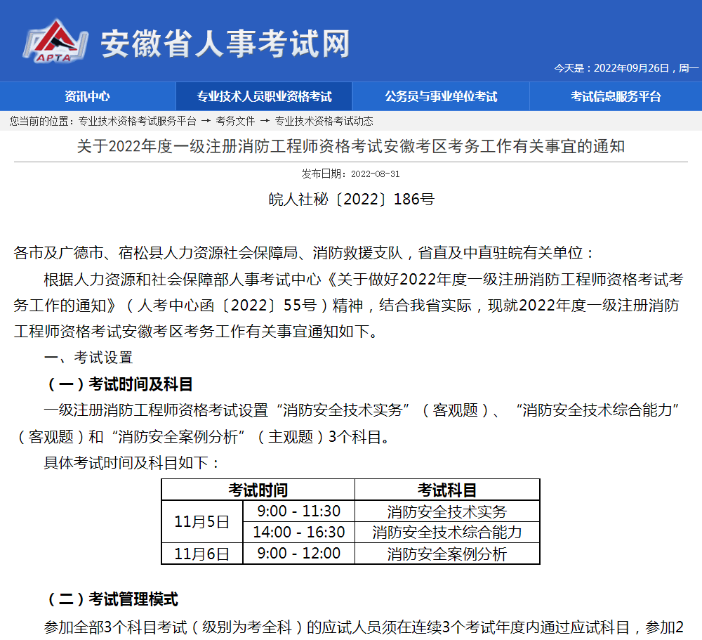 根据人力资源和社会保障部人事考试中心《关于做好2022年度一级注册消防工程师资格考试考务工作的通知》(人考中心函〔2022〕55号)精神,结合我省实际,现就2022年度一级注册消防工程师资格考试安徽考区考务工作有关事宜通知如下。