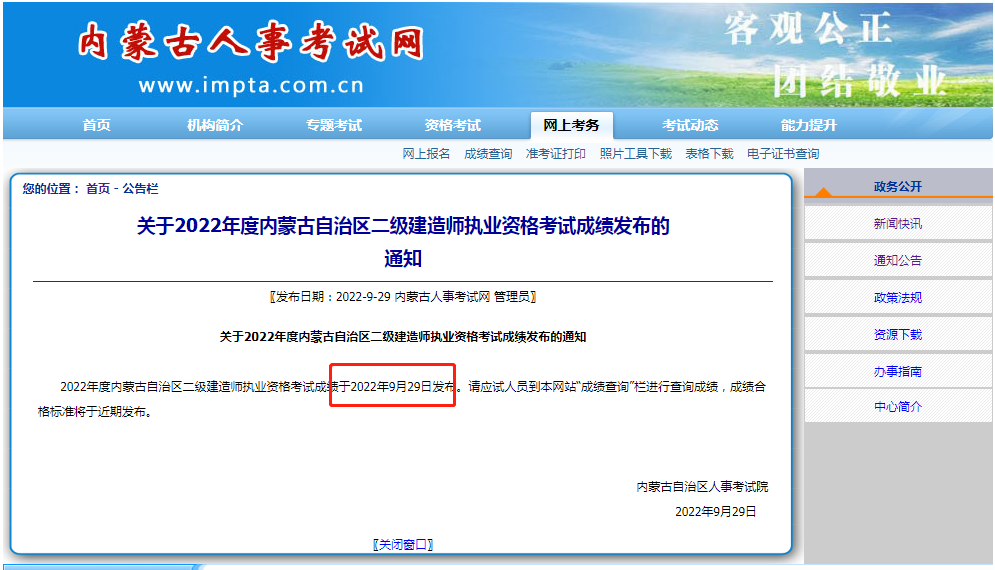 2022年内蒙古二级建造师成绩查询时间:2022年9月29日起