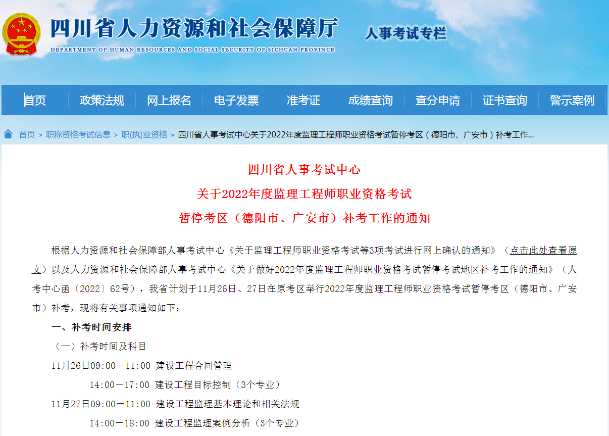 四川根据人力资源和社会保障部人事考试中心《关于监理工程师职业资格考试等3项考试进行网上确认的通知》(点击此处查看原文)以及人力资源和社会保障部人事考试中心《关于做好2022年度监理工程师职业资格考试暂停考试地区补考工作的通知》(人考中心函〔2022〕62号),我省计划于11月26日、27日在原考区举行2022年度监理工程师职业资格考试暂停考区(德阳市、广安市)补考,现将有关事项通知如下: