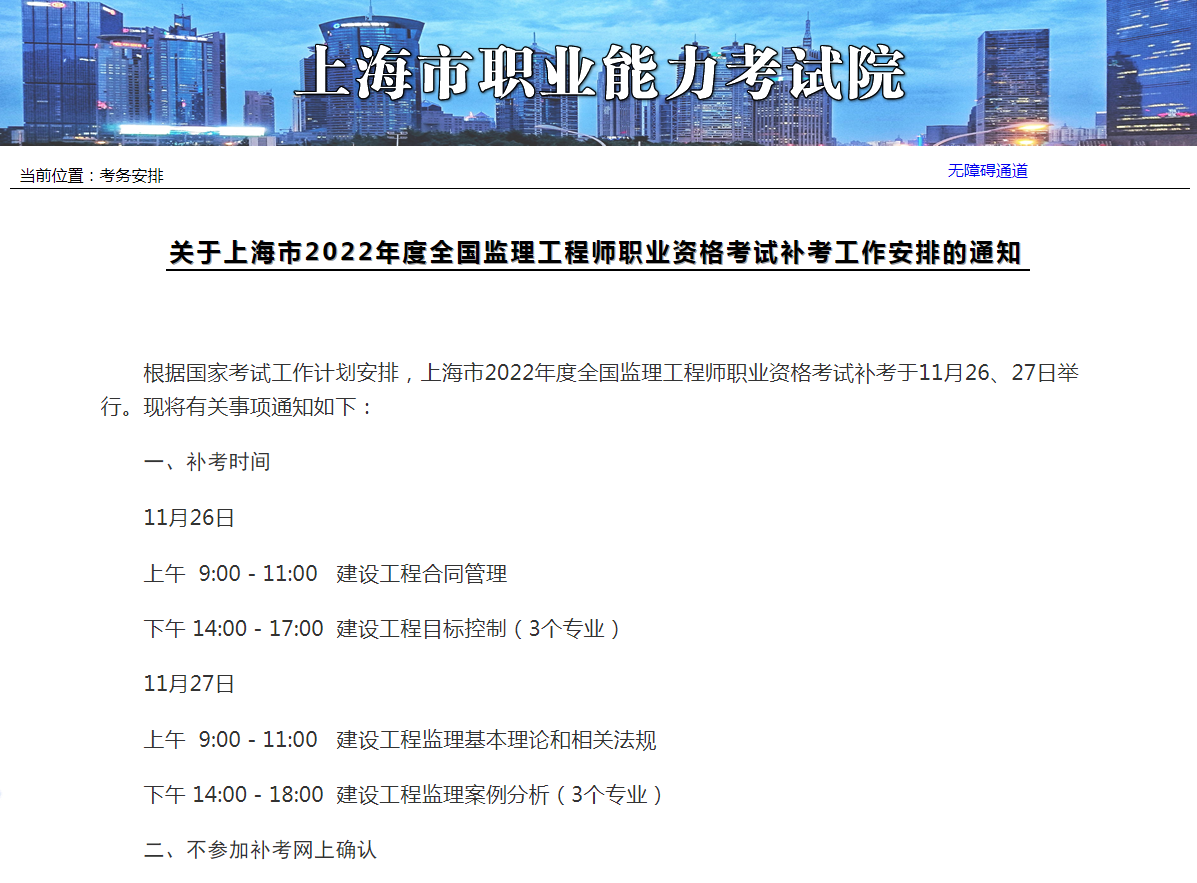 根据国家考试工作计划安排,上海市2022年度全国监理工程师职业资格考试补考于11月26、27日举行。