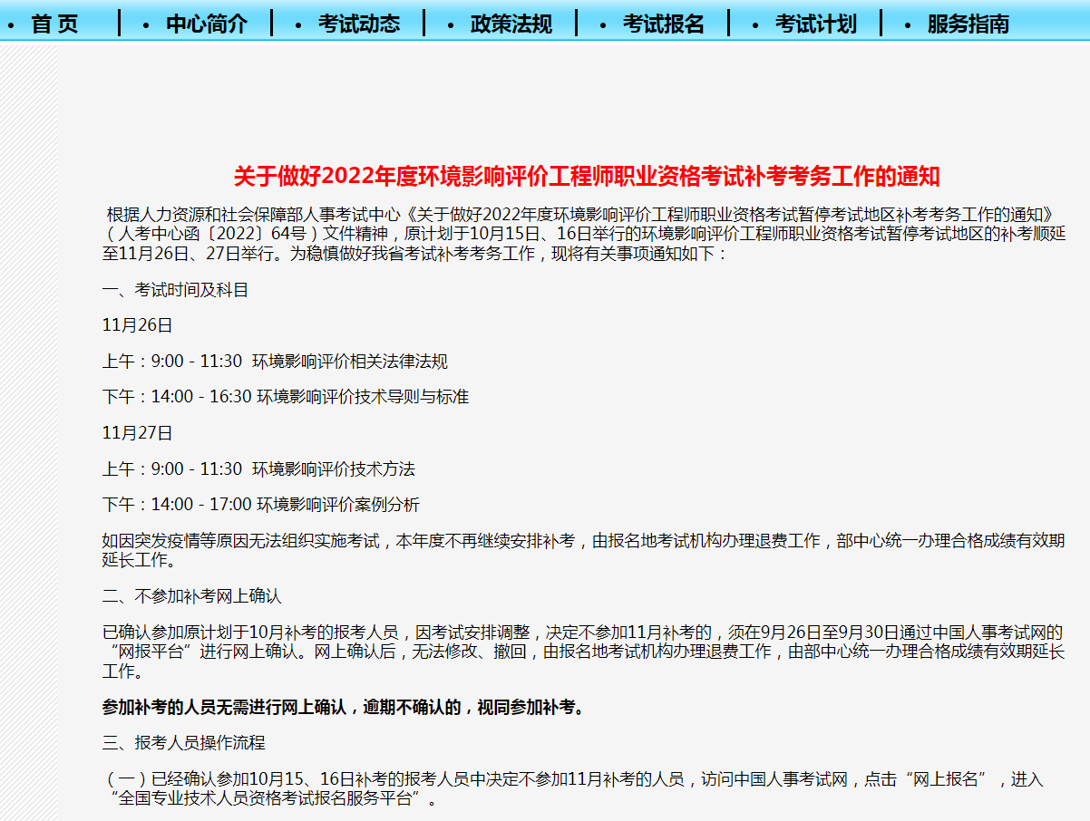 吉林根据人力资源和社会保障部人事考试中心《关于做好2022年度环境影响评价工程师职业资格考试暂停考试地区补考考务工作的通知》(人考中心函〔2022〕64号)文件精神,原计划于10月15日、16日举行的环境影响评价工程师职业资格考试暂停考试地区的补考顺延至11月26日、27日举行。为稳慎做好我省考试补考考务工作,现将有关事项通知如下:
