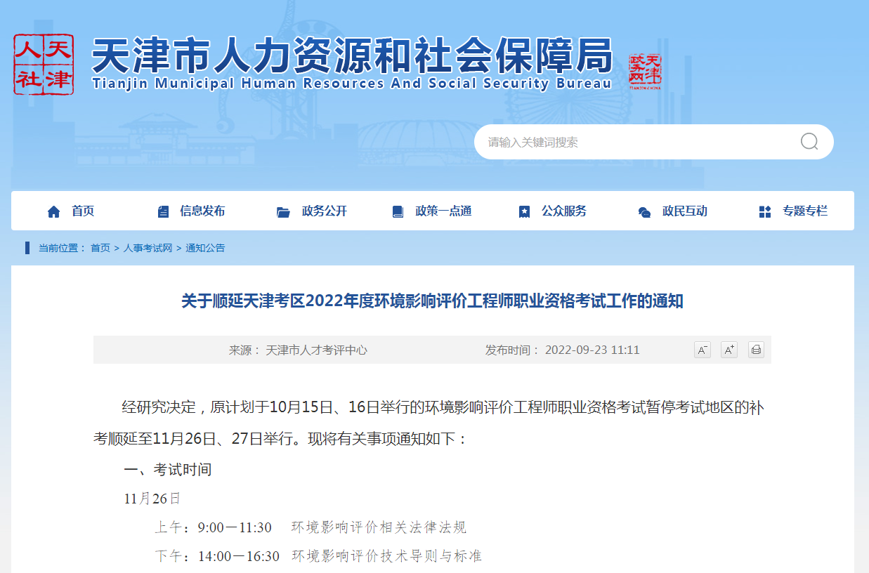 天津经研究决定,原计划于10月15日、16日举行的环境影响评价工程师职业资格考试暂停考试地区的补考顺延至11月26日、27日举行。现将有关事项通知如下: