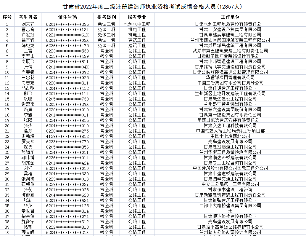 根据《人力资源社会保障部人事考试中心关于印发<专业技术人员职业资格考试报名证明事项告知承诺制工作规程>的通知》(人考中心函〔2021〕1号)有关要求,现将甘肃省2022年度二级注册建造师执业资格考试成绩合格人员予以公示,共12857人 ( 名单见附件)。
