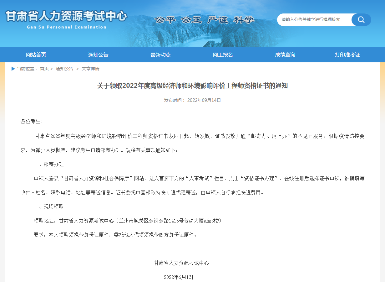 甘肃省2022年度高级经济师和环境影响评价工程师资格证书从即日起开始发放,证书发放开通“邮寄办、网上办”的不见面服务。根据疫情防控要求,为减少人员聚集,建议考生申请邮寄办理。现将有关事项通知如下: