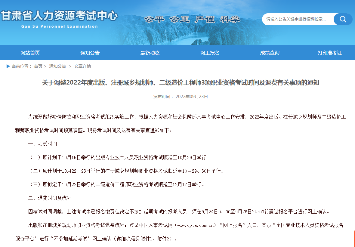 关于调整2022年度出版、注册城乡规划师、二级造价工程师3项职业资格考试时间及退费有关事项的通知