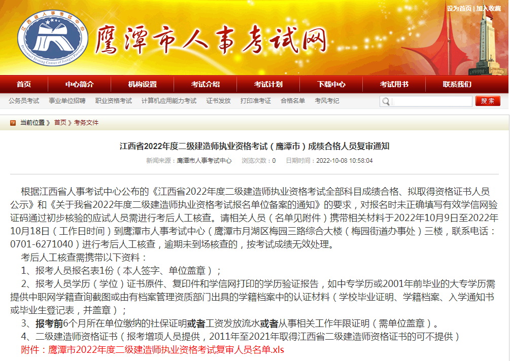 根据江西省人事考试中心公布的《江西省2022年度二级建造师执业资格考试全部科目成绩合格、拟取得资格证书人员公示》和《关于我省2022年度二级建造师执业资格考试报名单位备案的通知》的要求,对报名时未正确填写有效学信网验证码通过初步核验的应试人员需进行考后人工核查。请相关人员(名单见附件)携带相关材料于2022年10月9日至2022年10月18日(工作日时间)到鹰潭市人事考试中心(鹰潭市月湖区梅园三路综合大楼(梅园街道办事处)三楼,联系电话:0701-6271040)进行考后人工核查,逾期未到场核查的,按考试成绩无效处理。