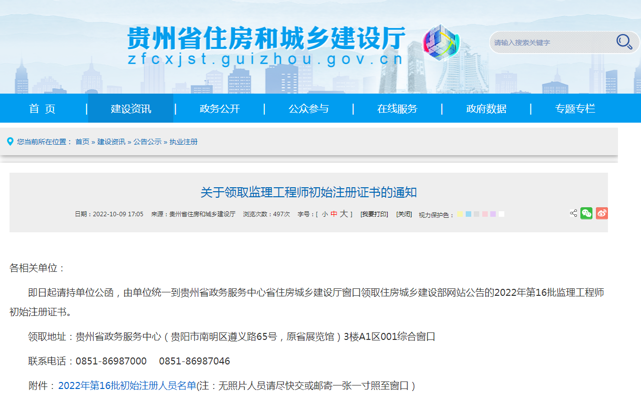 2022年10月9日起请持单位公函,由单位统一到贵州省政务服务中心省住房城乡建设厅窗口领取住房城乡建设部网站公告的2022年第16批监理工程师初始注册证书。