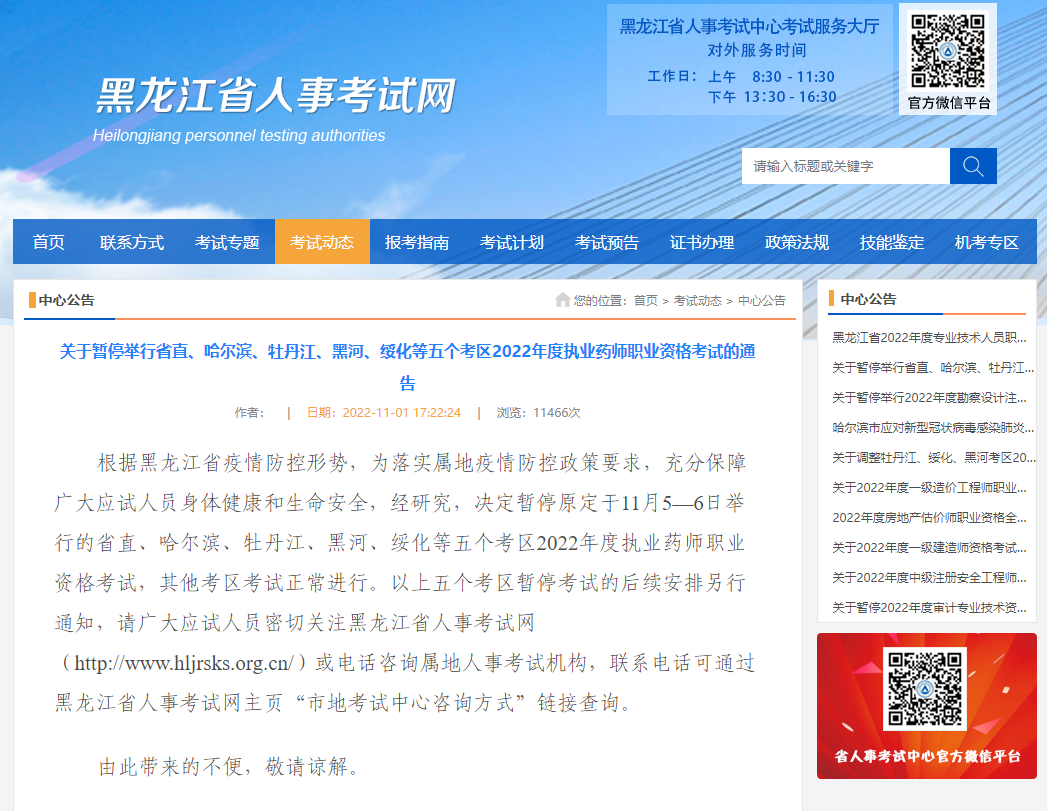根据黑龙江省疫情防控形势,为落实属地疫情防控政策要求,充分保障广大应试人员身体健康和生命安全,经研究,决定暂停原定于11月5—6日举行的省直、哈尔滨、牡丹江、黑河、绥化等五个考区2022年度执业药师职业资格考试,其他考区考试正常进行。以上五个考区暂停考试的后续安排另行通知,请广大应试人员密切关注黑龙江省人事考试网(http://www.hljrsks.org.cn/)或电话咨询属地人事考试机构,联系电话可通过黑龙江省人事考试网主页“市地考试中心咨询方式”链接查询。