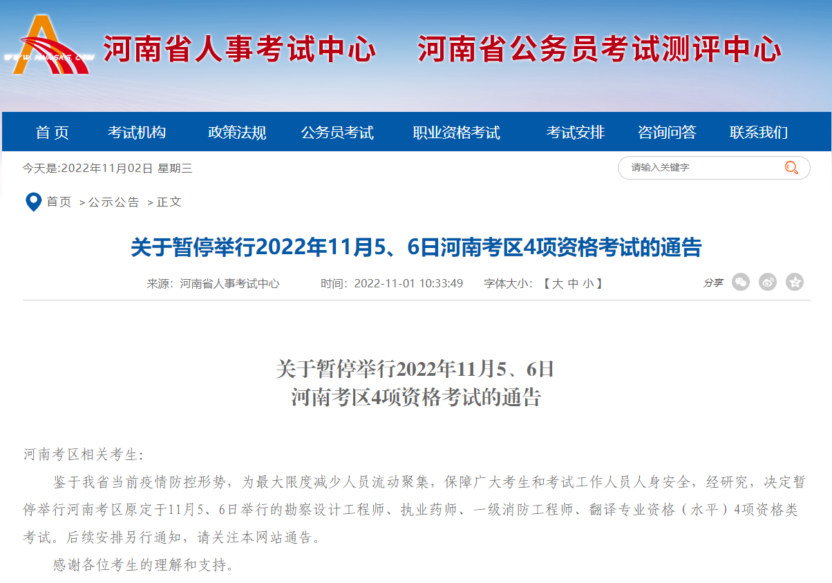 关于暂停举行2022年11月5、6日河南考区4项资格考试的通告