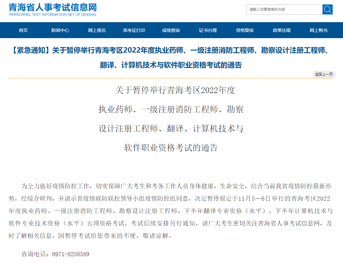 为全力做好疫情防控工作,切实保障广大考生和考务工作人员身体健康、生命安全,结合当前我省疫情防控最新形势,经综合研判,并请示省疫情联防联控领导小组疫情防控组同意,决定暂停原定于11月5—6日举行的青海考区2022年度执业药师、一级注册消防工程师、勘察设计注册工程师、下半年翻译专业资格(水平)、下半年计算机技术与软件专业技术资格(水平)五项资格考试。考试后续安排另行通知,请广大考生密切关注青海省人事考试信息网,及时了解相关信息。因暂停考试给您带来的不便,敬请谅解。
