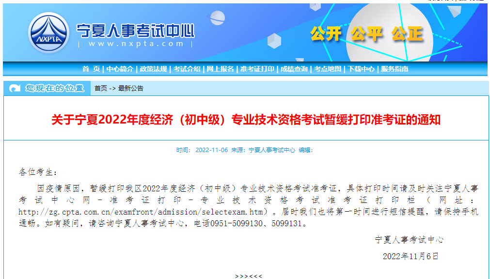 因疫情原因,暂缓打印我区2022年度经济(初中级)专业技术资格考试准考证,具体打印时间请及时关注宁夏人事考试中心网-准考证打印-专业技术资格考试准考证打印栏(网址:http://zg.cpta.com.cn/examfront/admission/selectexam.htm)。届时我们也将第一时间进行短信提醒,请保持手机通畅。如有疑问,请咨询宁夏人事考试中心,电话0951-5099130、5099131。