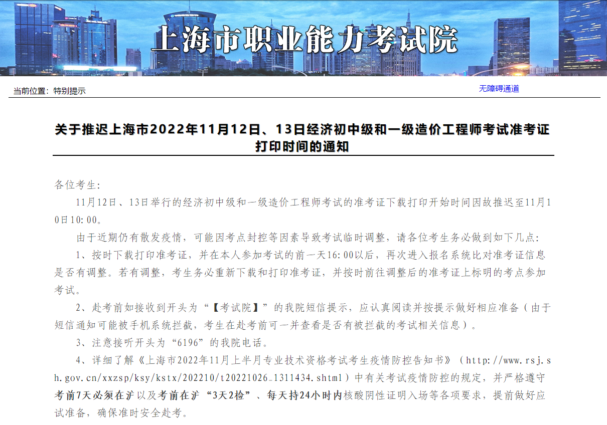 11月12日、13日举行的经济初中级和一级造价工程师考试的准考证下载打印开始时间因故推迟至11月10日10:00。