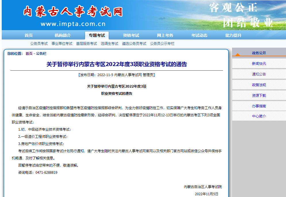 经请示自治区疫情防控指挥部和各盟市考区疫情防控指挥部综合研判,为全力做好疫情防控工作,切实保障广大考生和考务工作人员身体健康、生命安全,结合当前内蒙古疫情防控最新形势,经综合研判,决定暂停原定于2022年11月12-13日举行的内蒙古考区下列3项全国职业资格考试: