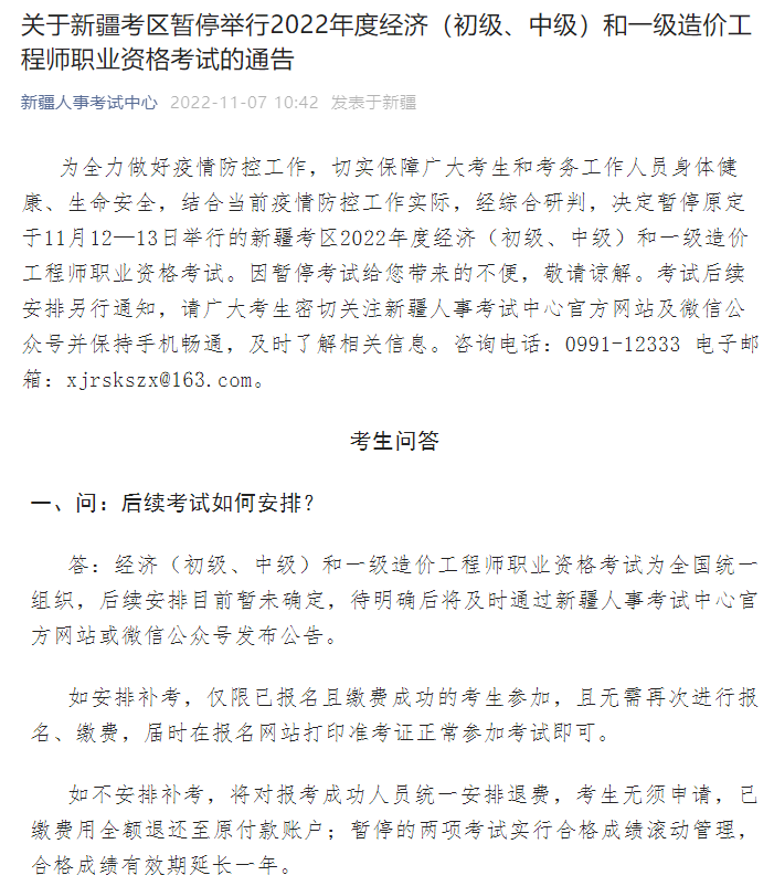 为全力做好疫情防控工作,切实保障广大考生和考务工作人员身体健康、生命安全,结合当前疫情防控工作实际,经综合研判,决定暂停原定于11月12—13日举行的新疆考区2022年度经济(初级、中级)和一级造价工程师职业资格考试。因暂停考试给您带来的不便,敬请谅解。考试后续安排另行通知,请广大考生密切关注新疆人事考试中心官方网站及微信公众号并保持手机畅通,及时了解相关信息。咨询电话:0991-12333 电子邮箱:xjrskszx@163.com。
